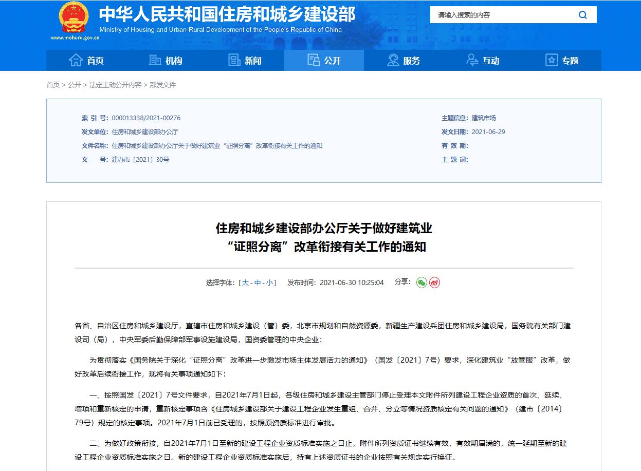 自2021年7月1日起,各級住房和城鄉(xiāng)建設(shè)主管部門停止受理本文附件所列建設(shè)工程企業(yè)資質(zhì)的首次、延續(xù)、增項和重新核定的申請,重新核定事項含《住房城鄉(xiāng)建設(shè)部關(guān)于建設(shè)工程企業(yè)發(fā)生重組、合并、分立等情況資質(zhì)核定有關(guān)問題的通知》(建市〔2014〕79號)規(guī)定的核定事項。
